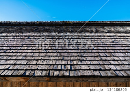 Weathered Wooden Shingle Roof Texture Against a Vivid Blue Sky on a Sunny Day.