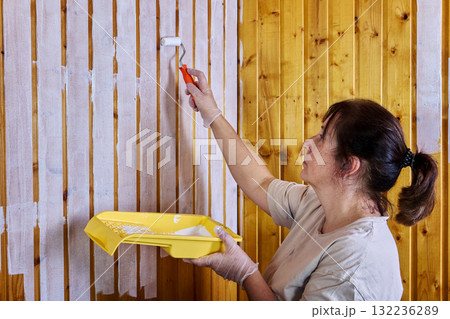 Painting wooden wall panels with white paint using roller.