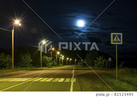 view of a night paved road with a pedestrian crossing on a moonlit night