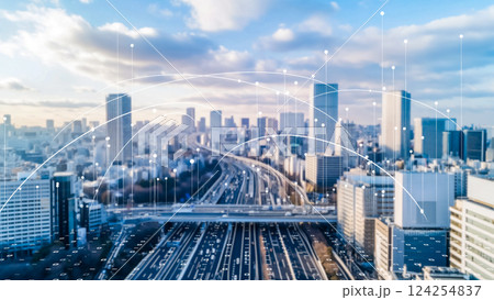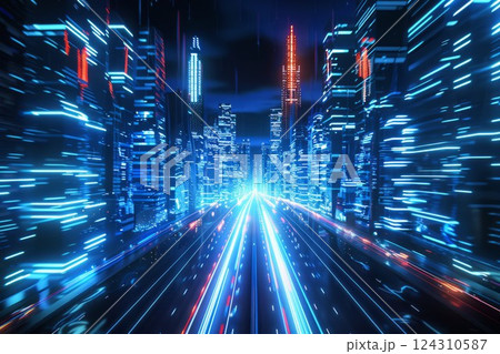 都会の夜景 高層ビル群 光 通信 ネットワーク CG イラスト
