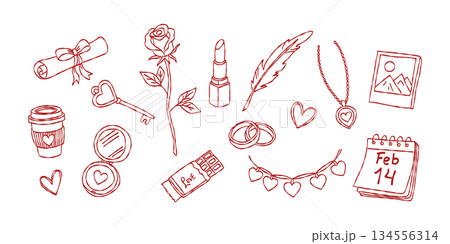 Red lipstick and jewelry necklace valentine hand drawn doodle vector, romantic chocolate and rose sketch illustration, minimalist love beauty elements