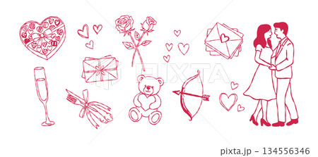 Romantic couple and Valentine's day gift set hand drawn doodle vector, heart chocolate box and teddy bear sketch illustration, love elements