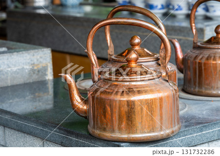 Tea set on wooden table in Chengdu cafe during afternoon sunlight