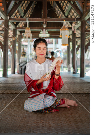 A woman in traditional Thai clothing sits in a wooden pavilion, holding a floral garland, showcasing cultural heritage.