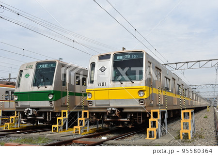 車両基地で並ぶ東京メトロ7000系と6000系