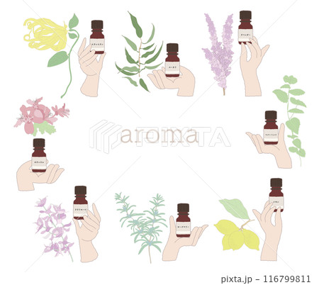 精油を持つ手・ローズマリー・イランイラン・ラベンダー・ペパーミント・ユーカリ・クラリセージ・レモン・