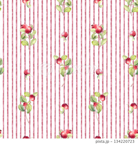 Seamless pattern with red fruit soft foliage on pink stripes background. Watercolor lingonberry vibrant summer print hand painted. Botanical repeat on stripped for kitchen fabric, scrapbooking.