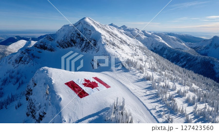 Canadian flag on snowy mountain peak in majestic winter landscape.