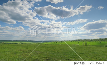 A Vibrant Green Landscape Under a Beautiful Blue Sky Adorned with Fluffy White Clouds Time lapse.