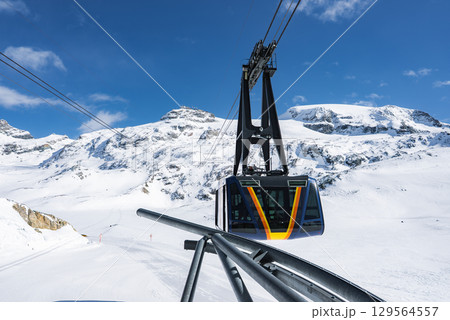 A sleek black and yellow ski lift cable car ascends over snow covered peaks in Zermatt, Switzerland, with a clear blue sky and rugged alpine terrain.