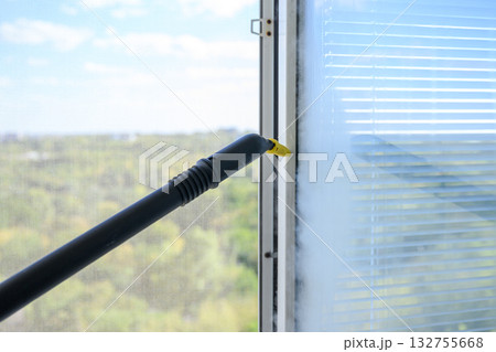 Cleaning window with steam cleaner indoors close-up.