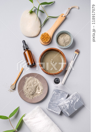 Organic cosmetic with blue clay, serum, soap, brush and towel on a light background with shadow.
