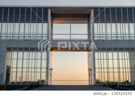 夕焼けに染まる葛西臨海公園クリスタルビューのシンメトリー建築