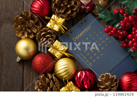 Holly Christmas plant and gold ornaments toys, Christmas design
