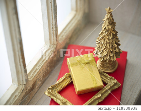 レトロな窓辺に置かれたプレゼントとクリスマス小物