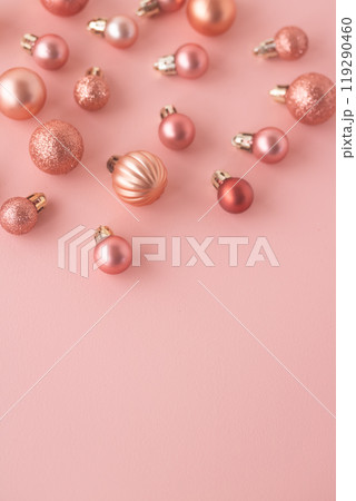 クリスマスツリーのリボンで飾ったプレゼント包みとガラスボール縦