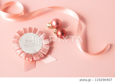 クリスマスツリーのリボンで飾ったプレゼント包みとガラスボール