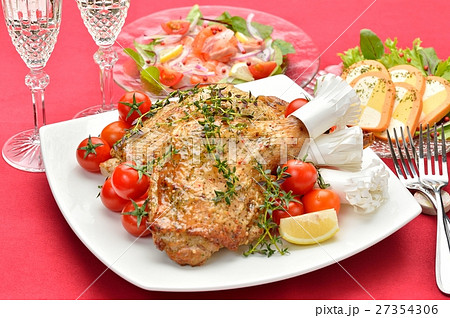クリスマスディナー、クリスマス料理のイメージ。ローストチキン(バジル味)、鯛とサーモンのカルパッチョ