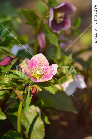 庭のピンクのクリスマスローズの花のクローズアップ、ピンクのヘレボルス、ガーデニング