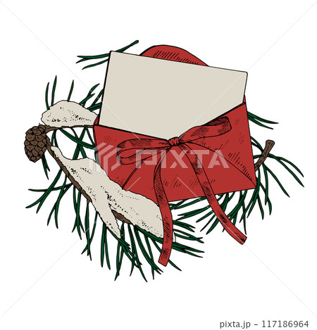 Letter to Santa Claus. Vector outline illustration. Hand drawn holiday red envelope with fir branch. Vintage xmas line art. Christmas card drawing on transparent background. For inscriptions or text