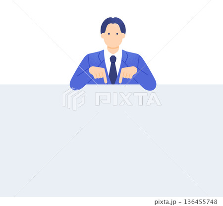 両手で下を指差すスーツ姿の男性。テキストスペースを示すビジネスマンのベクターイラスト素材。
