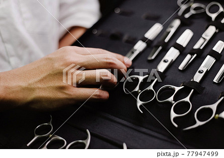 Hair salon concept a collection of scissors made of stainless in different sizes kept in specific leather case