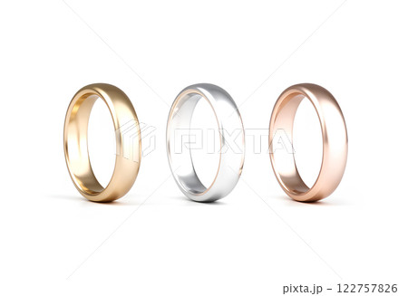 Rings set stand isolated, golden, silver, pink gold jewelry. White gold wedding bracelet with micro scratches. Yellow, siller and rose gift metal bracelet.