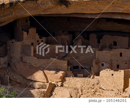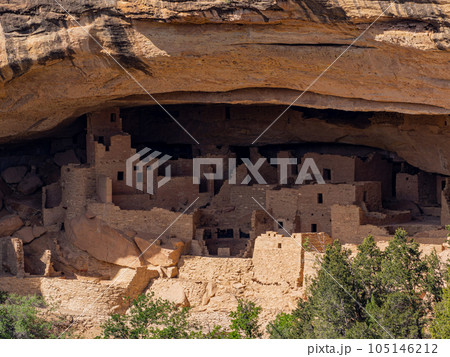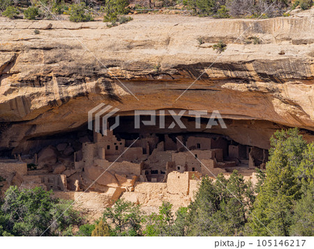 Cliff Palace ruins sit under massive rock overhang in Mesa Verde National Park, Colorado, USA. Ancient Ancestral Puebloan cliff dwelling features multi-story stone buildings and kivas in UNESCO World