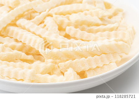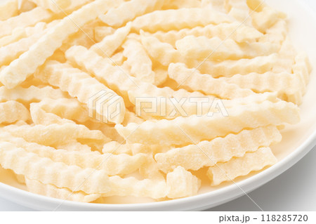 冷凍のクリンクルカットのフライドポテトのクローズアップ
