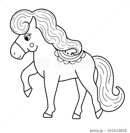 Fairy tale black and white horse with green saddle isolated on white background. Vector line fantasy animal. Medieval fairytale horse character. Cartoon magic icon or coloring page