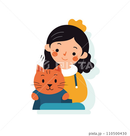 A girl is happily holding a smiling orange cat in this vector illustration.