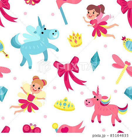 Fairy Unicorn with Twisted Horn and Flying Pixie Vector Seamless Pattern