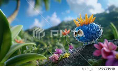 Cute Floral monsters, meadows spirits magic background. Mountain ranges above the blooming valley. Photo wallpaper