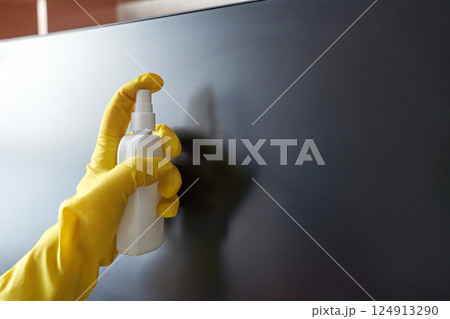 Gloved hand cleaning screen with spray bottle for hygiene and maintenance