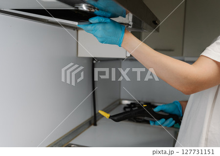 Housekeeper wearing blue gloves removing kitchen hood filter for cleaning with steam cleaner, ensuring thorough maintenance and hygiene in kitchen room. Concept of cleanliness and household.