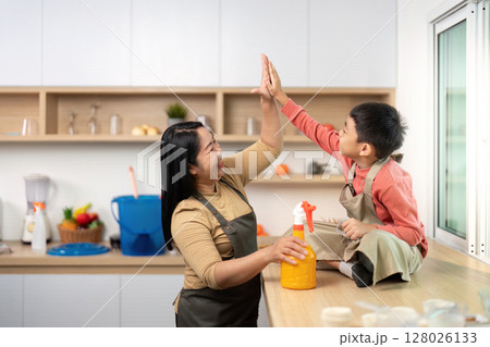 Family Bonding During Cleaning. Mother and son share a high-five while tidying up the kitchen.