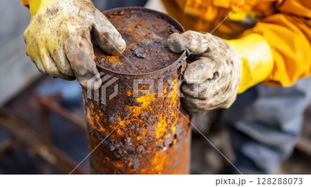 Worker handling a rusty metal pipe in an industrial setting during the daytime