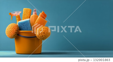 Bright Cleaning Supplies Arranged in a Yellow Bucket on a Blue Background During Daylight