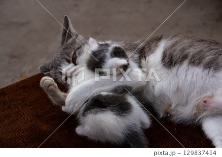 A gray and white mother cat washes her baby, cats in the village