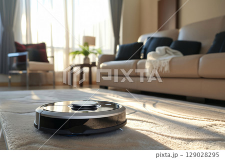Sleek robotic vacuum effortlessly glides across a plush carpet in a warmly lit living room, making housework a breeze in this modern, cozy home