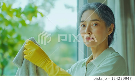 Senior woman cleaning with rubber gloves indoors