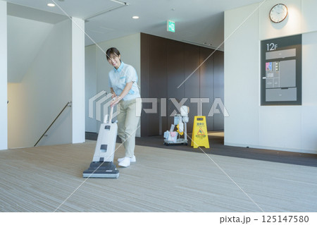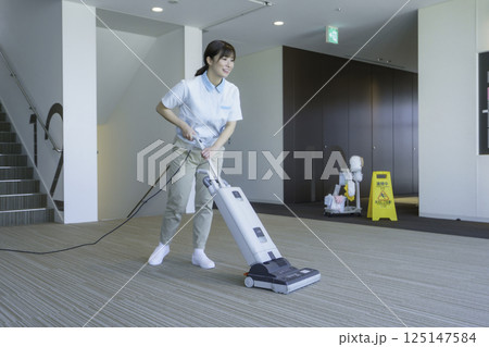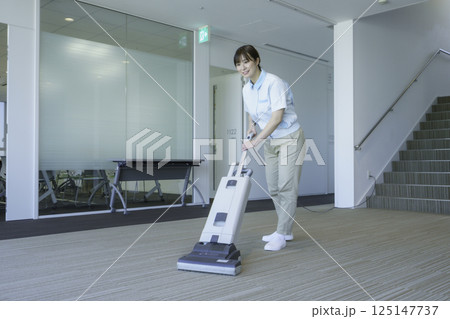 オフィスビルで掃除機をかける女性清掃員のポートレート 撮影協力:学校法人電波学園 東京電子専門学校