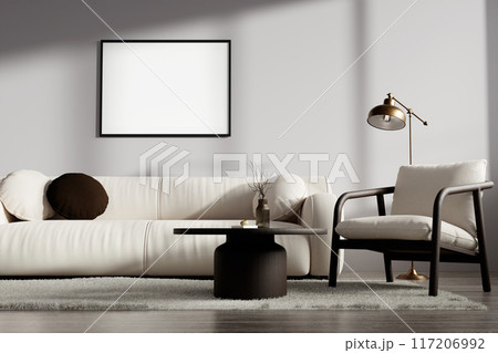 Modern 3D Interior Living Room with Blank Frame, Cozy Sofa, Coffee Table, and Indoor Plants in Minimalist Design