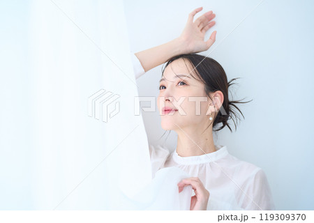 Close-up portrait of young woman model with modern make-up and long straight smooth hairstyle
