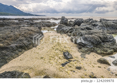 屋久島洋上アルプスの夕景(8月)斜光に輝く海岸と海