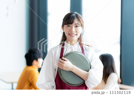 Smiling young female model woman with long brown smooth hairstyle holding straight iron. Hairdresser