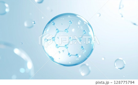 透明な水球に浮かぶ分子構造/スキンケア・美容・科学イメージ 背景素材