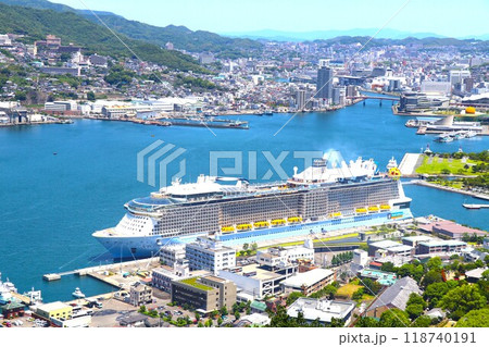 長崎市街地と長崎港に停泊する豪華客船