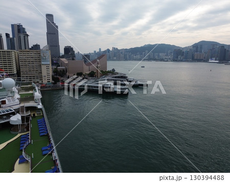 香港のオーシャンターミナルから九龍半島ビル群の空撮