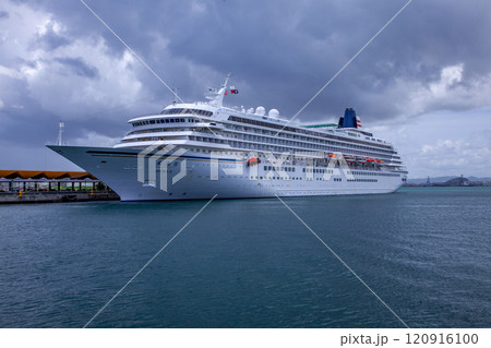 沖縄 那覇 那覇クルーズターミナルに停泊中の大型客船と観光バス